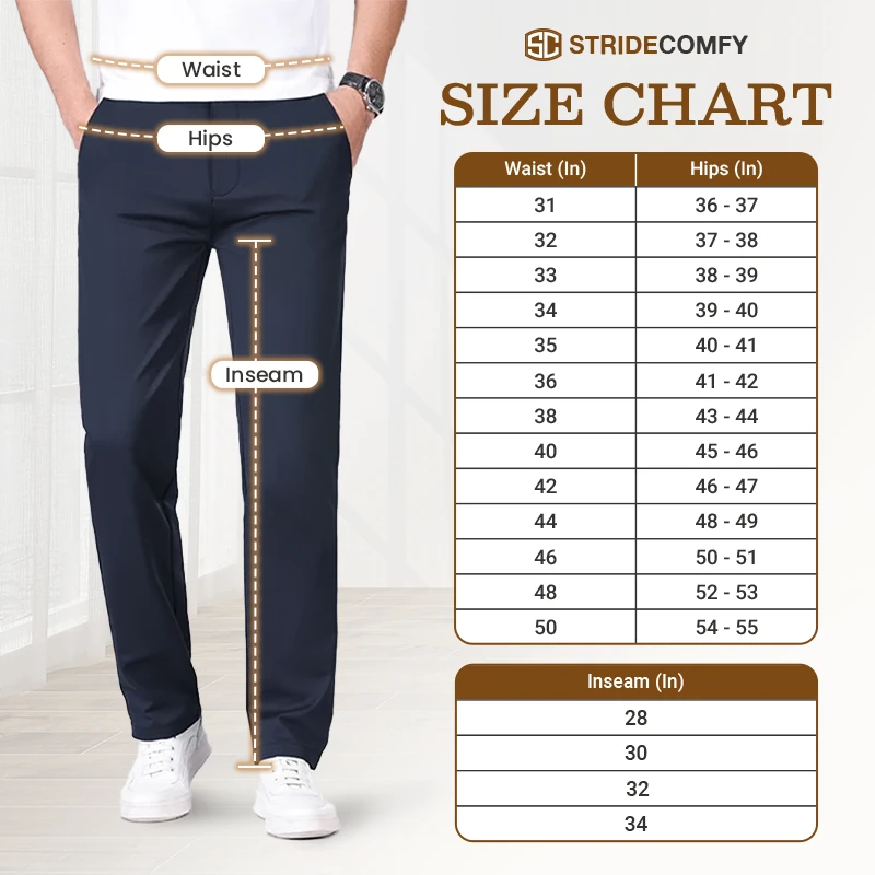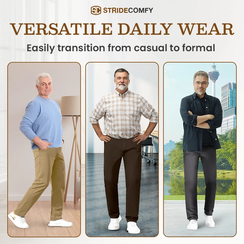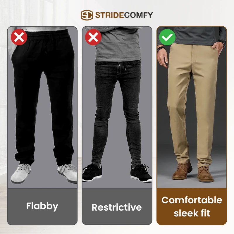 Avoid a frumpy or tight look with StrideComfy's elegant straight and classic fits